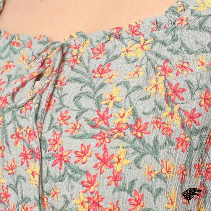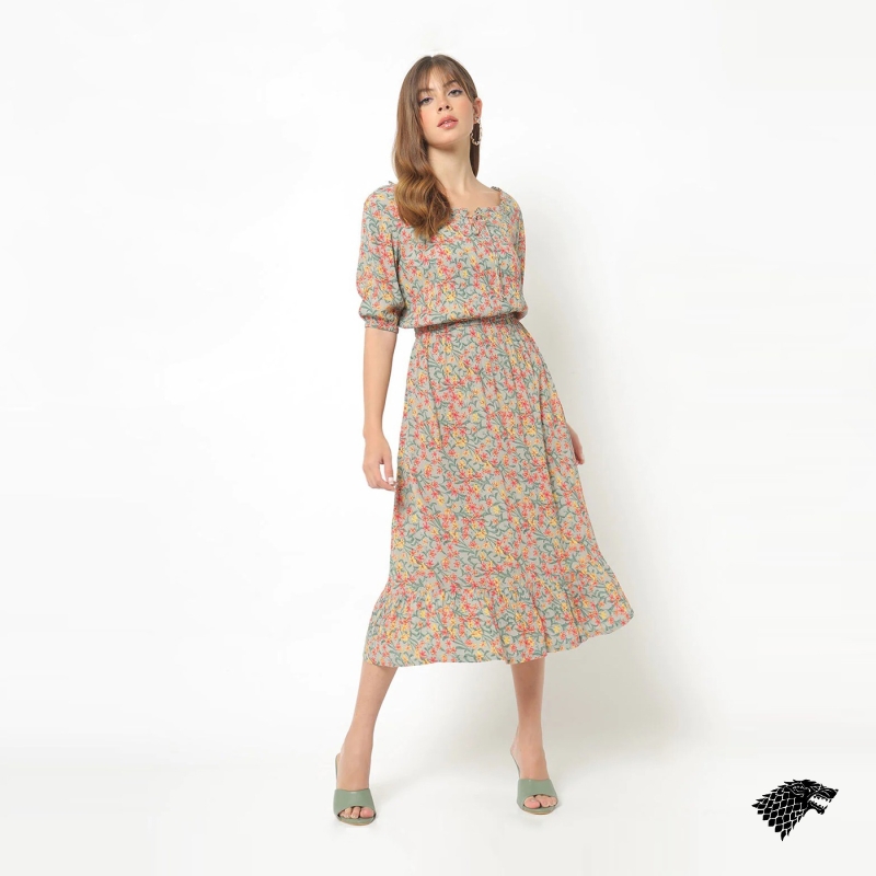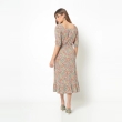 Printed woven A-line dress, has a round neck, three-quarter sleeves, an attached lining, and flared hem.