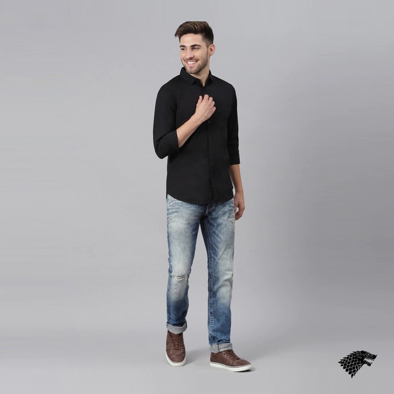 Black solid casual shirt, has a spread collar, button placket, and curved hem