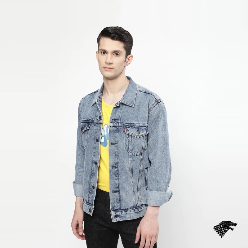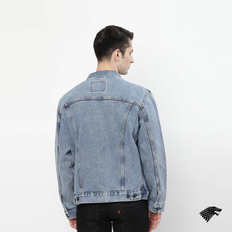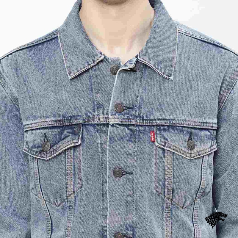 Blue washed waterless denim trucker jacket, has a spread collar, 4 pockets, button closure, long sleeves, straight hem, and cotton lining.