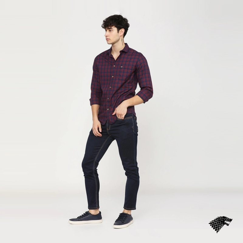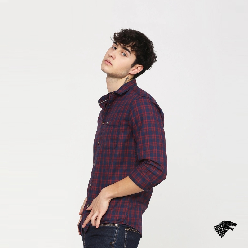 Maroon and Navy Blue checked casual shirt, has a spread collar, long sleeves, button placket, curved hem, and 1 patch pocket.