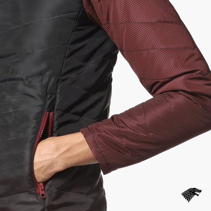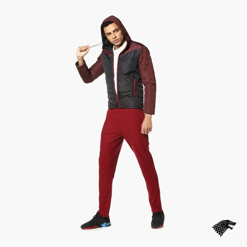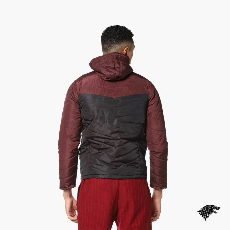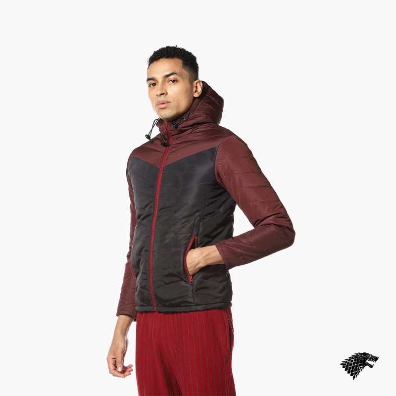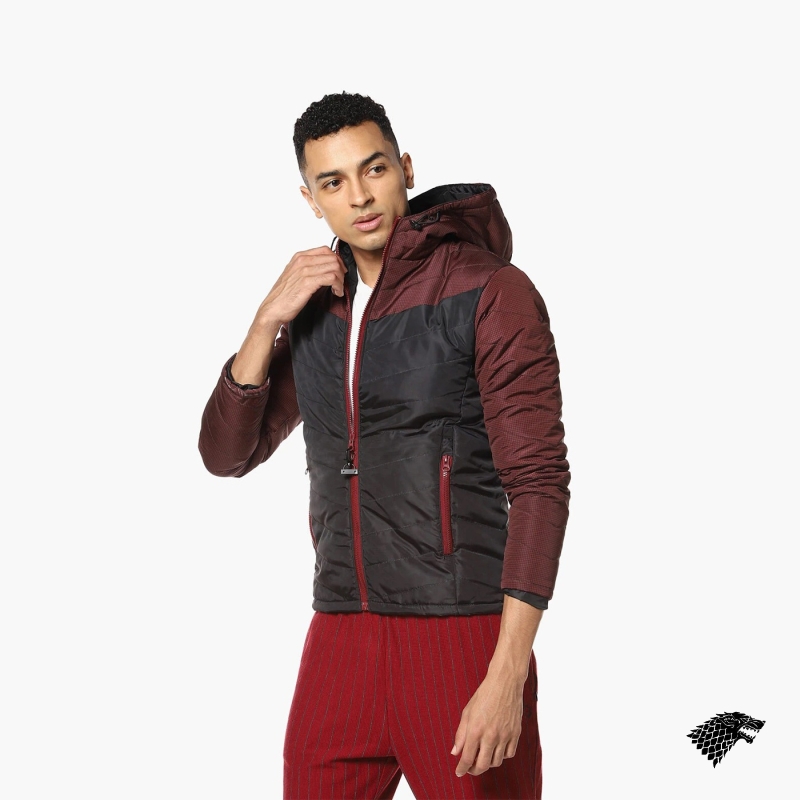 Maroon and Black colourblocked jacket, has a hooded, 2 pockets, zip closure, long sleeves, straight hem, and polyester lining.