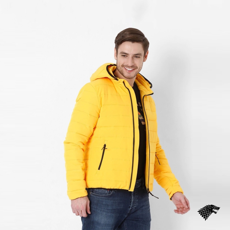 Yellow striped puffer jacket, has a hooded, 2 pockets ,has a zip closure, long sleeves, straight hemline, polyester lining.