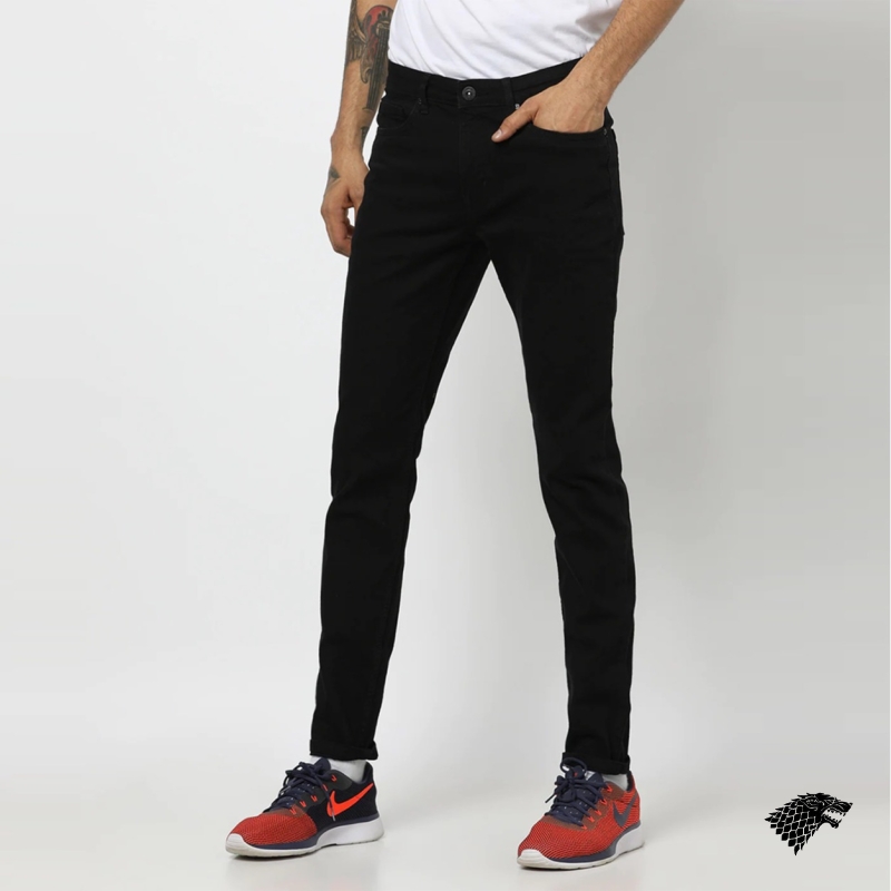 Black dark wash 5-pocket mid-rise jeans, clean look, no fade, has a button and zip closure, and waistband with belt loops