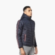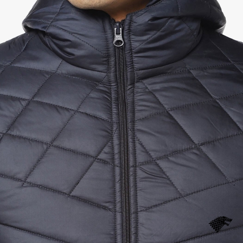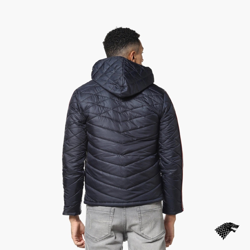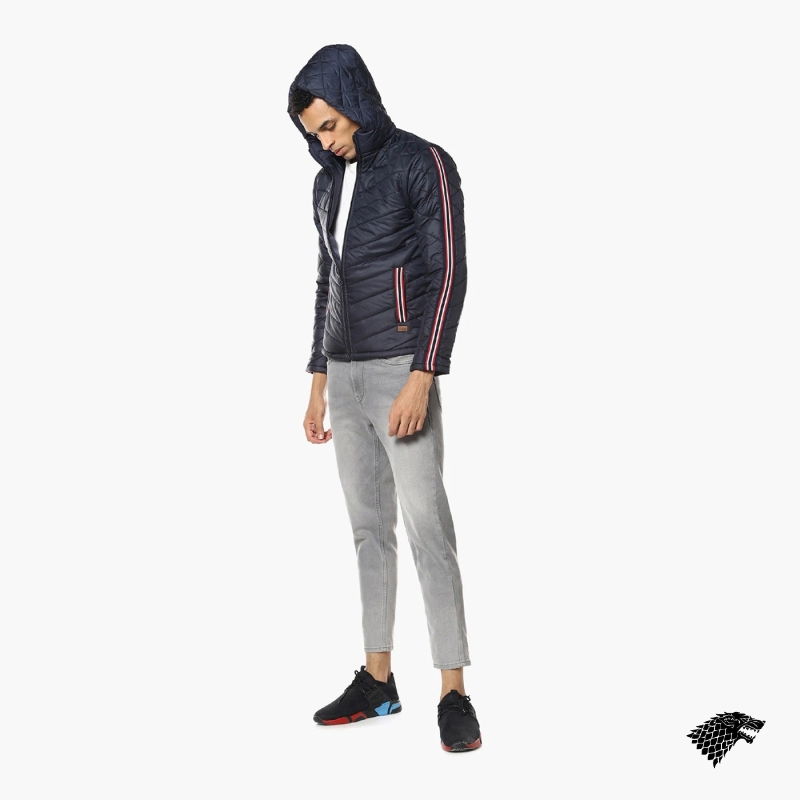 Navy blue geometric self design windcheater quilted jacket, has a hooded, 2 pockets ,has a zip closure, long sleeves, straight hemline, polyester lining.