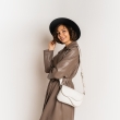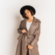 Brown solid faux leather font-open longline trench coat, has notched lapel collar, long sleeves and single vented hem