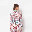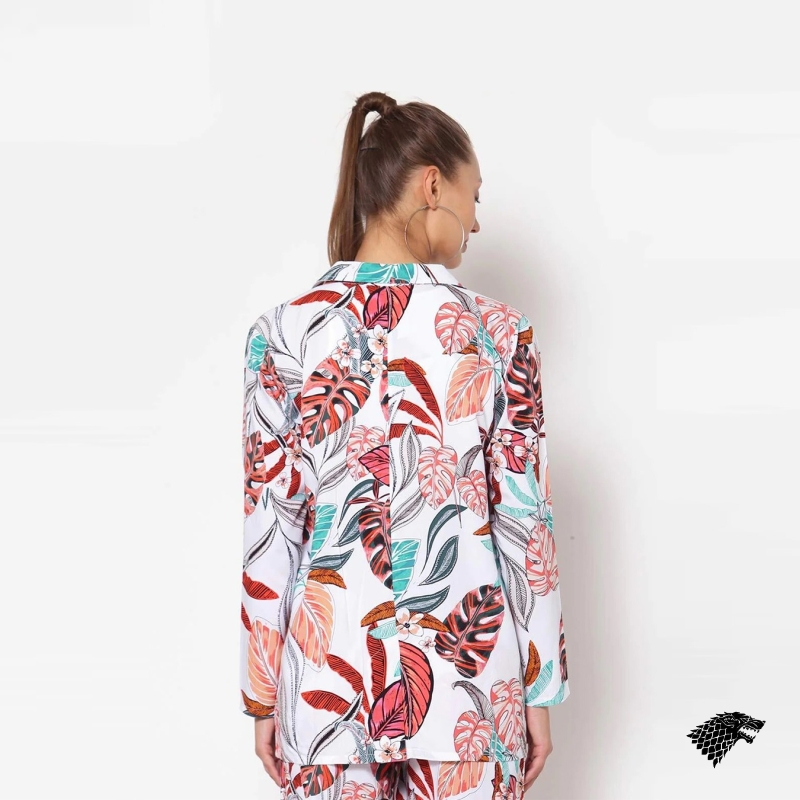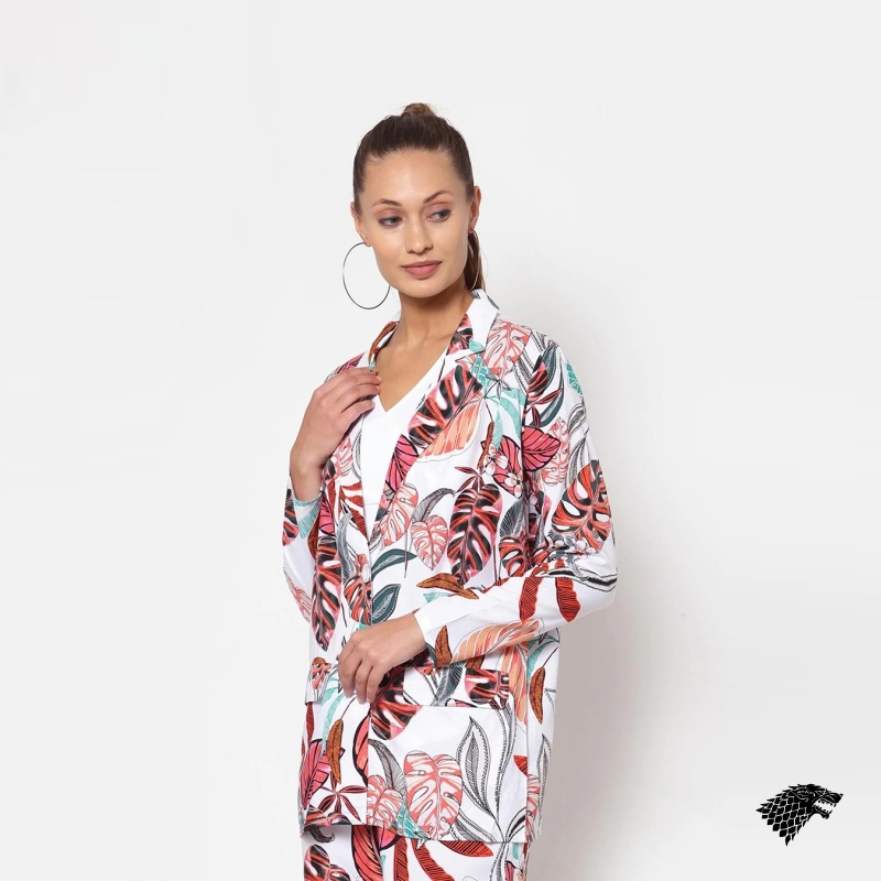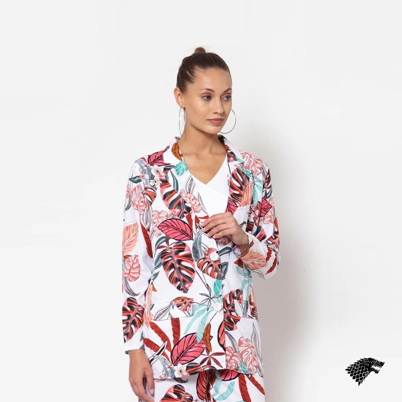 White floral printed single breasted blazer, has a notched lapel collar, short sleeves
