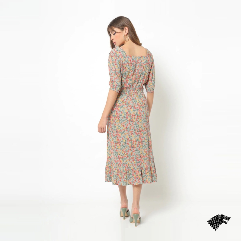 Printed woven A-line dress, has a round neck, three-quarter sleeves, an attached lining, and flared hem.