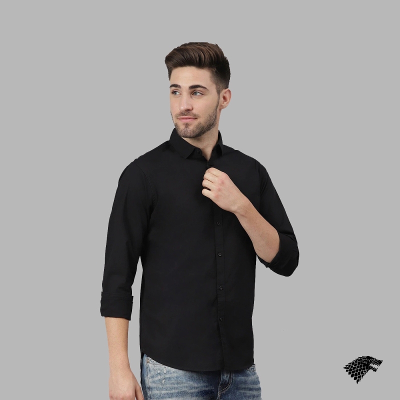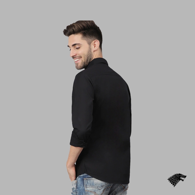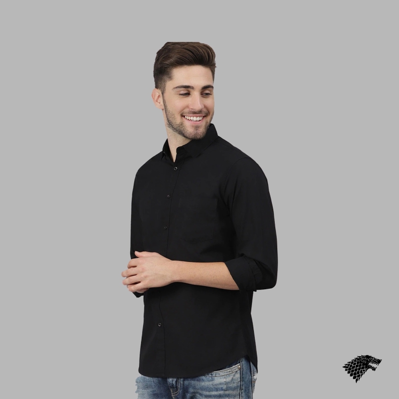 Black solid casual shirt, has a spread collar, button placket, and curved hem