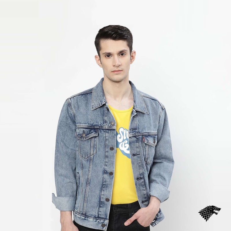 Blue washed waterless denim trucker jacket, has a spread collar, 4 pockets, button closure, long sleeves, straight hem, and cotton lining.
