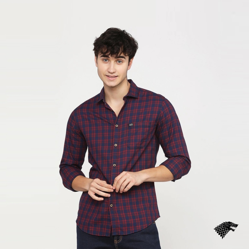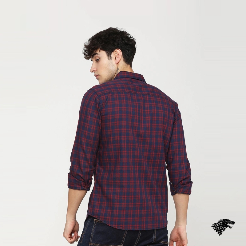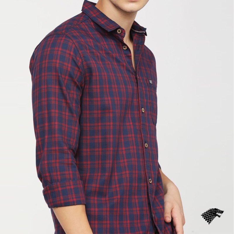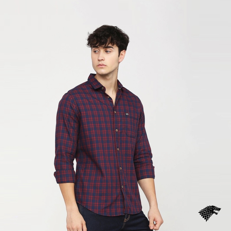 Maroon and Navy Blue checked casual shirt, has a spread collar, long sleeves, button placket, curved hem, and 1 patch pocket.