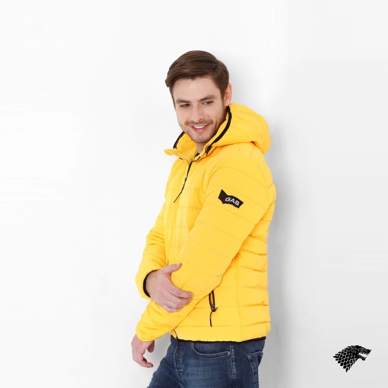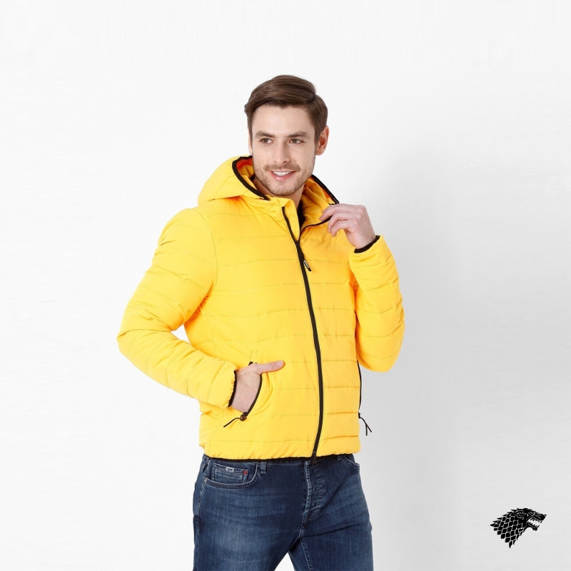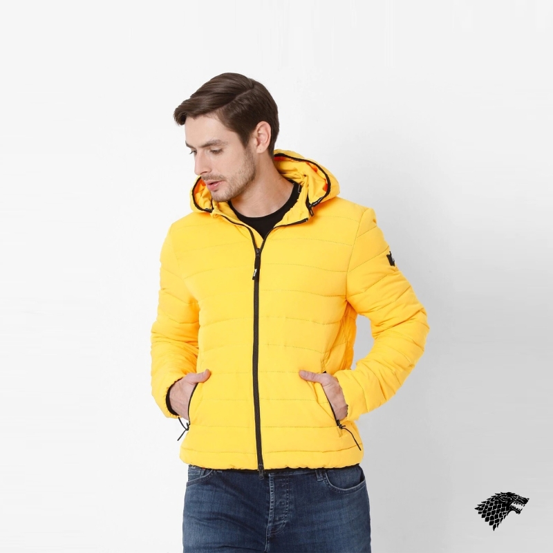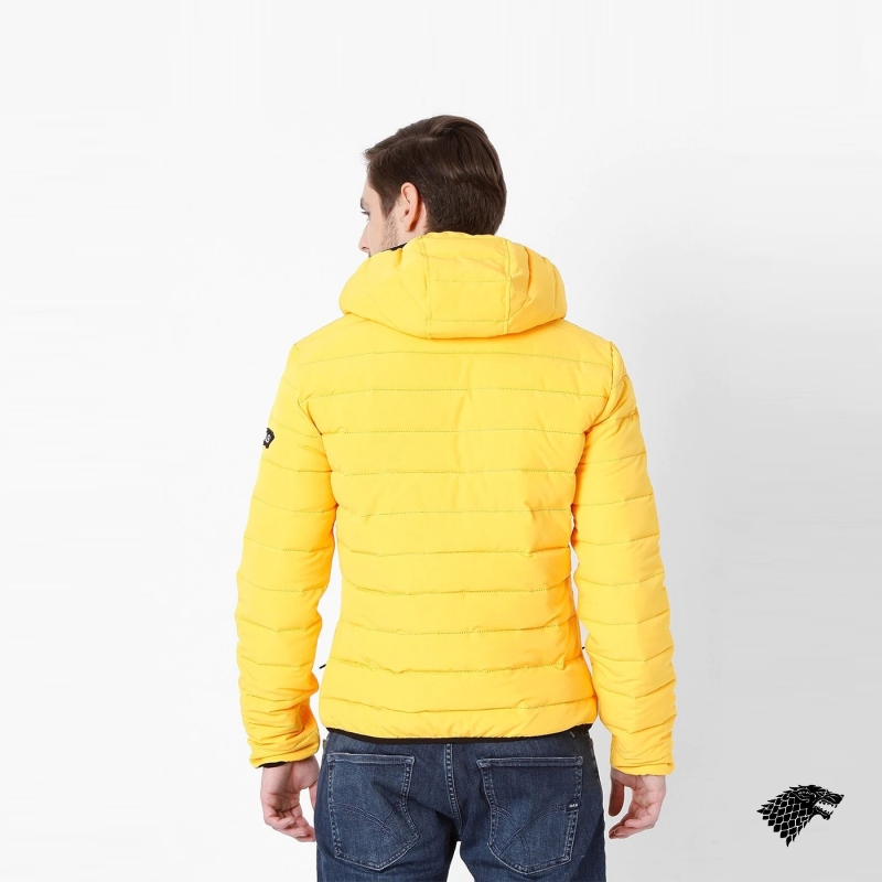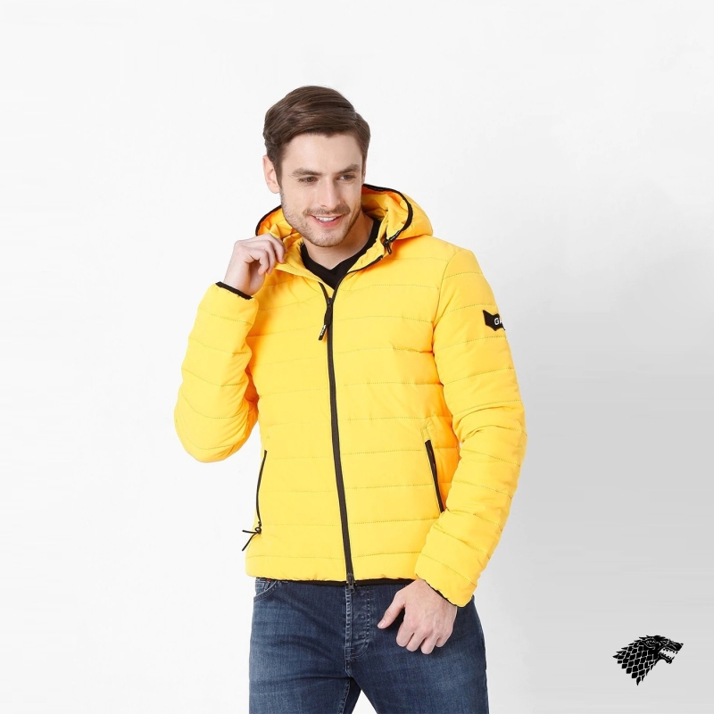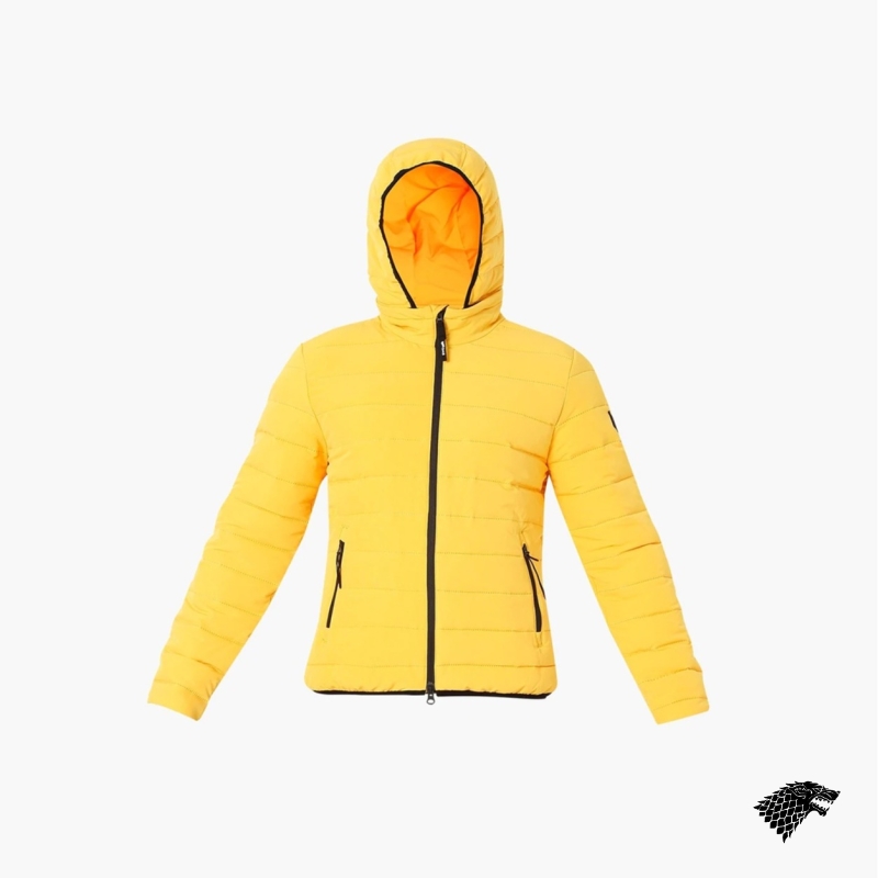 Yellow striped puffer jacket, has a hooded, 2 pockets ,has a zip closure, long sleeves, straight hemline, polyester lining.