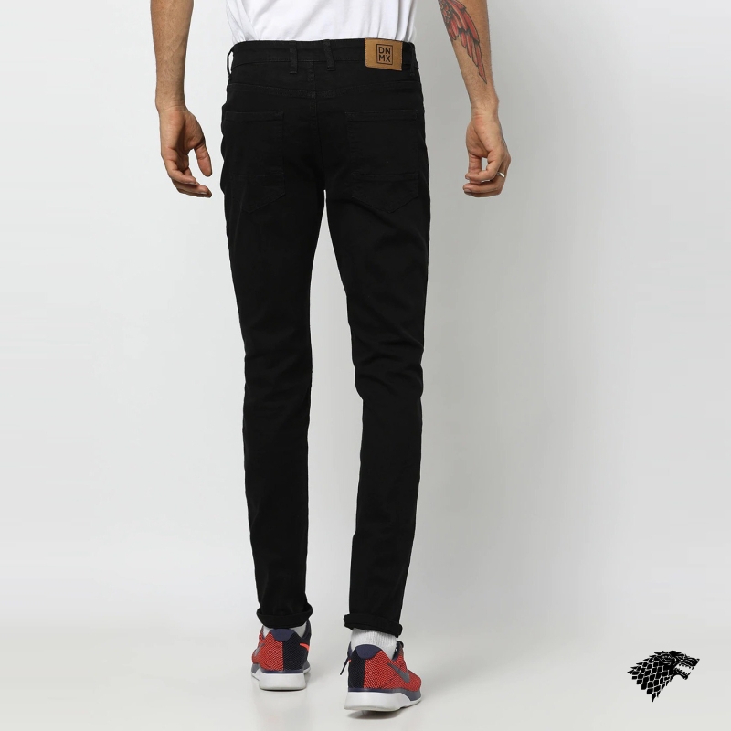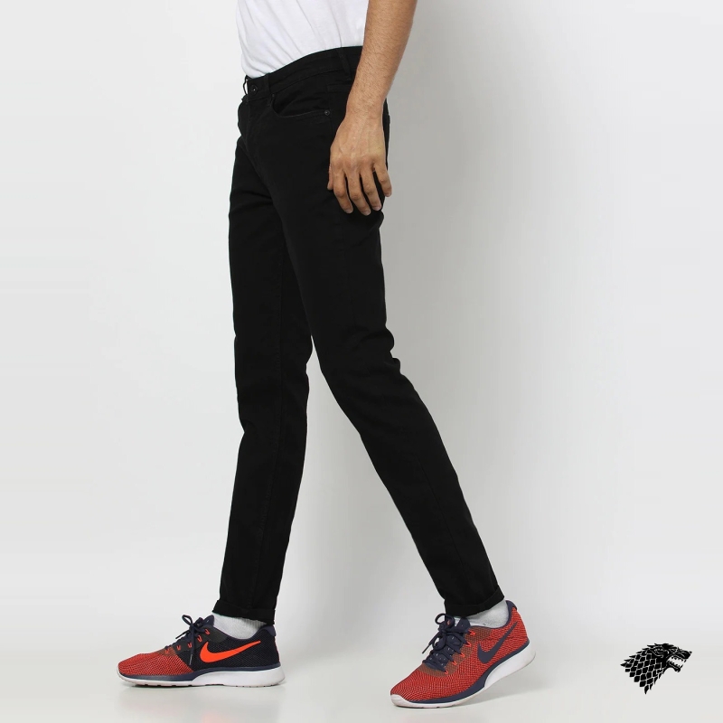 Black dark wash 5-pocket mid-rise jeans, clean look, no fade, has a button and zip closure, and waistband with belt loops