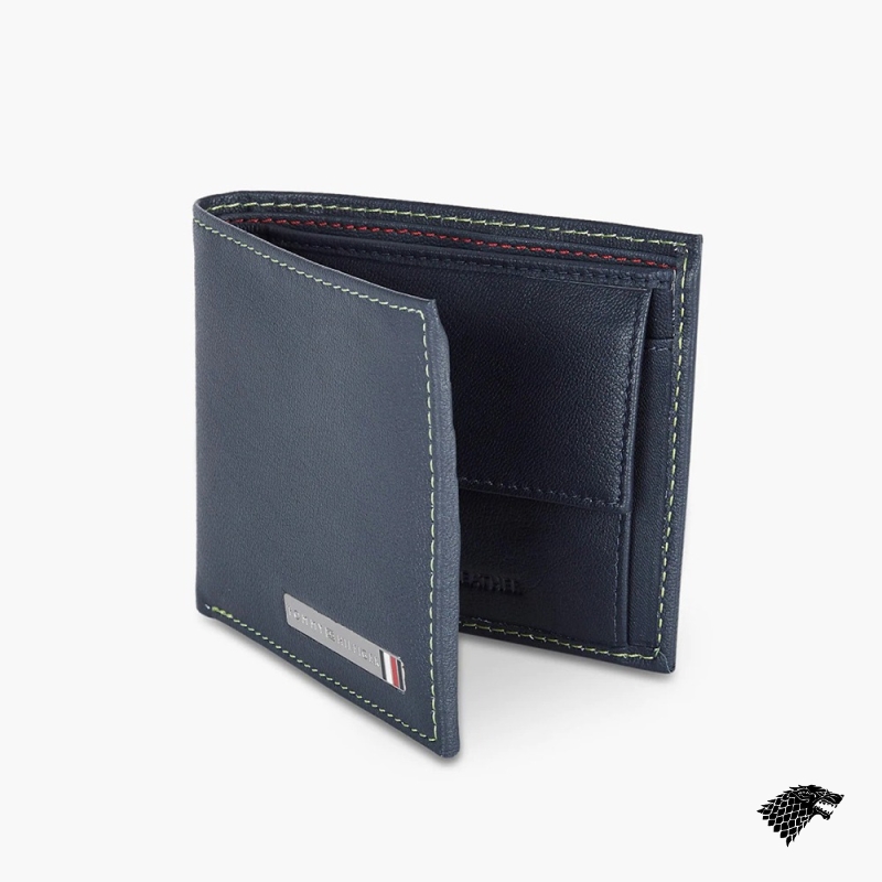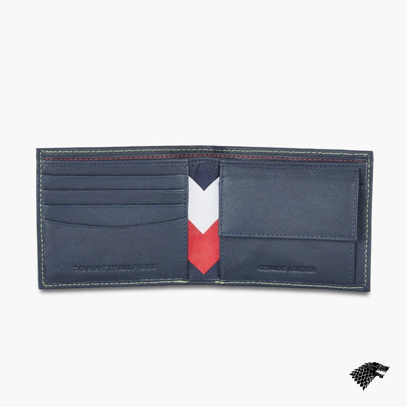Navy Blue solid two fold wallet 2 main compartments 4 card holders, 2 slip pockets, has a flap coin pocket
