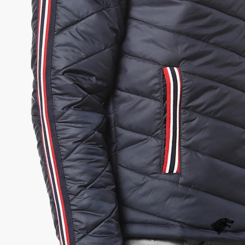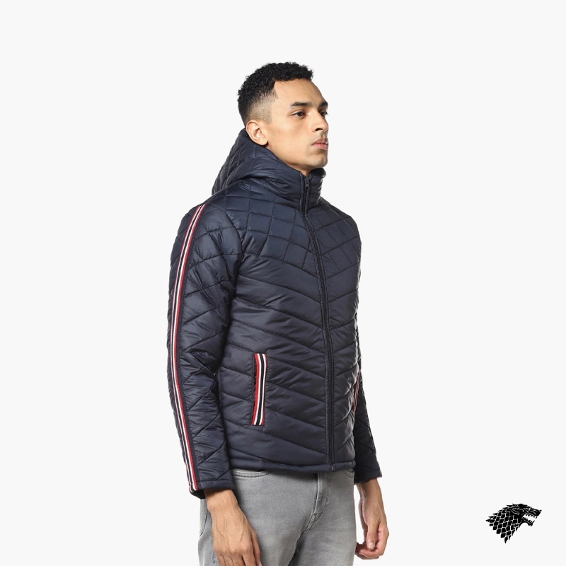 Navy blue geometric self design windcheater quilted jacket, has a hooded, 2 pockets ,has a zip closure, long sleeves, straight hemline, polyester lining.