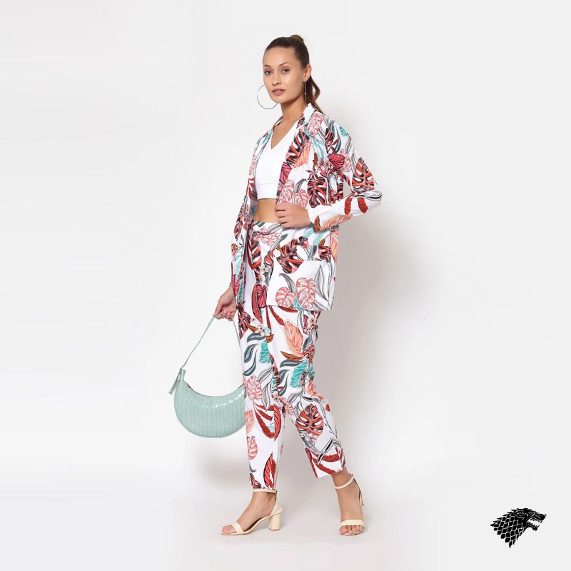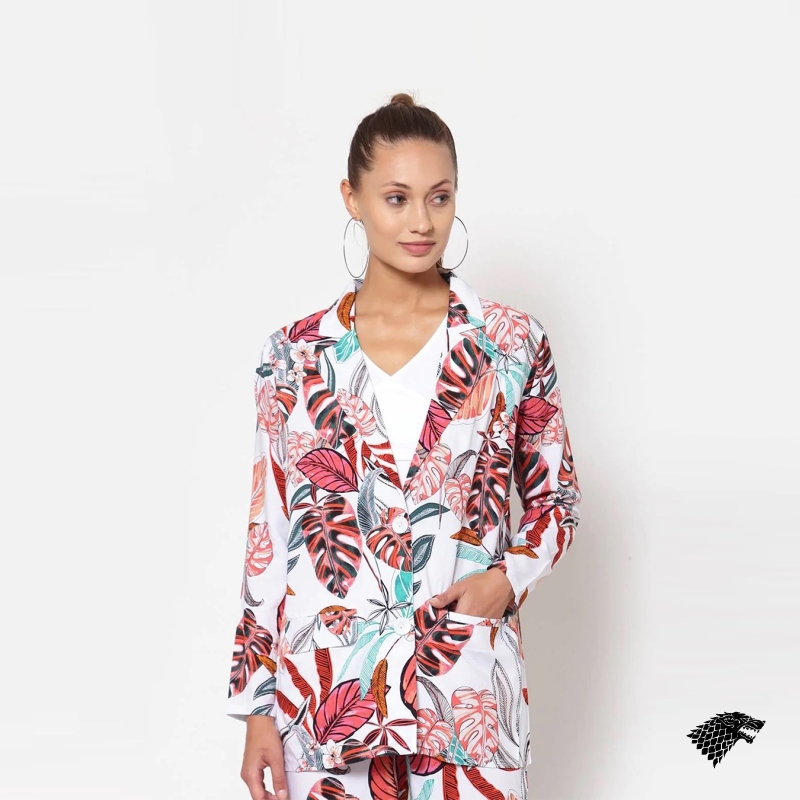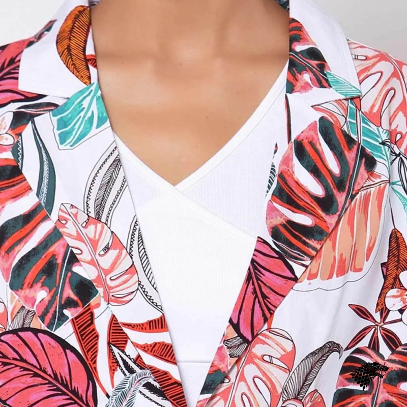 White floral printed single breasted blazer, has a notched lapel collar, short sleeves